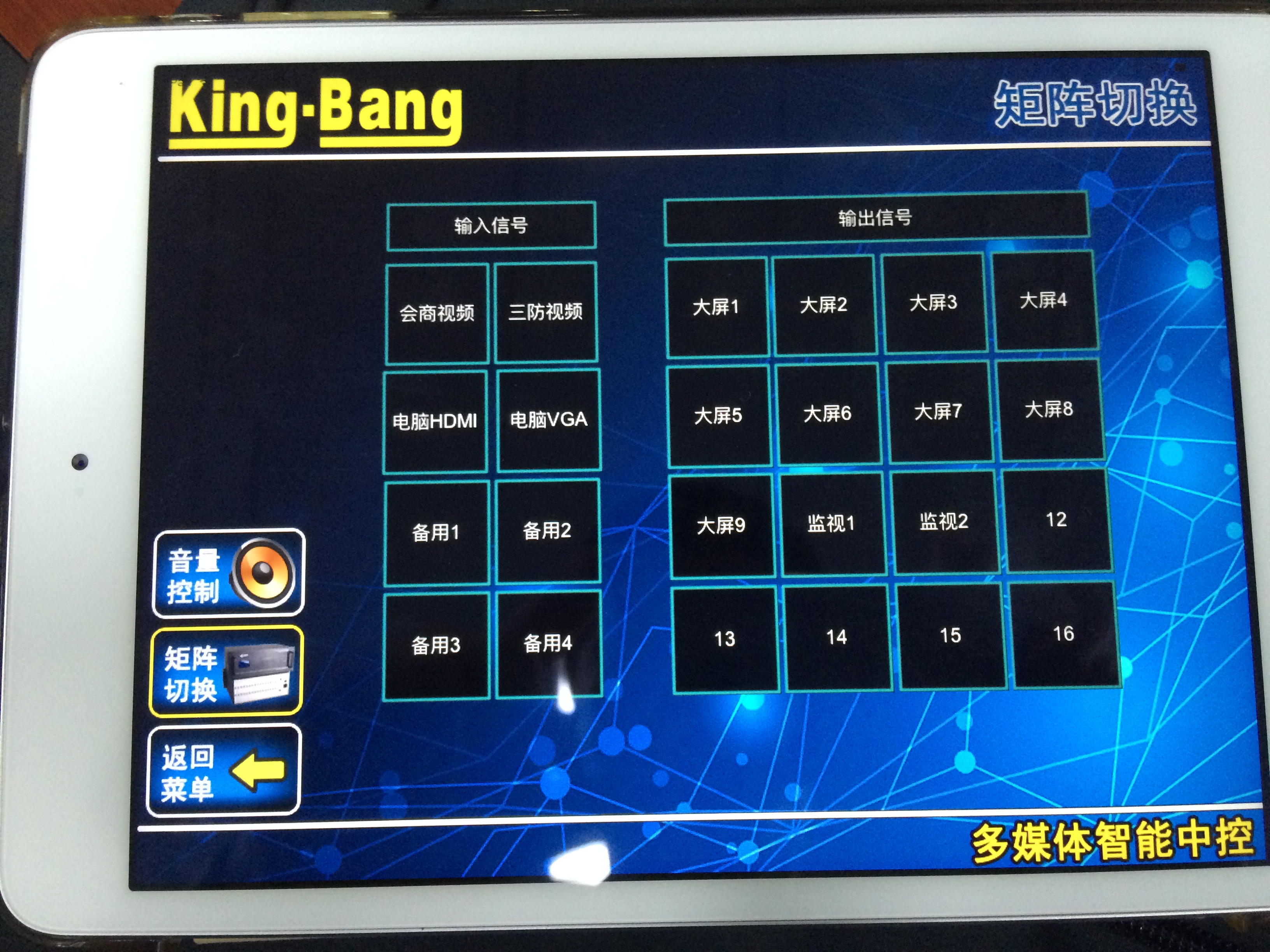 京邦電子(KING-BANG)以用戶為中心,根據(jù)茂名市化州氣象局會(huì)議室現(xiàn)場(chǎng)情況,并結(jié)合客戶需求,提出了一套完美的智能會(huì)議中控解決方案。京邦電子(KING-BANG)提供解決方案是采用的是可編程中央控制主機(jī)K-4960作為會(huì)議室控制系統(tǒng)的核心運(yùn)算主機(jī),對(duì)會(huì)議室的聲、光、電設(shè)備的操控進(jìn)行整合,然后經(jīng)過程序編寫將所有的控制集中到觸摸屏控制界面,搭配京邦電子(KING-BANG)其他中控周邊設(shè)備,完美實(shí)現(xiàn)一鍵智能化控制。